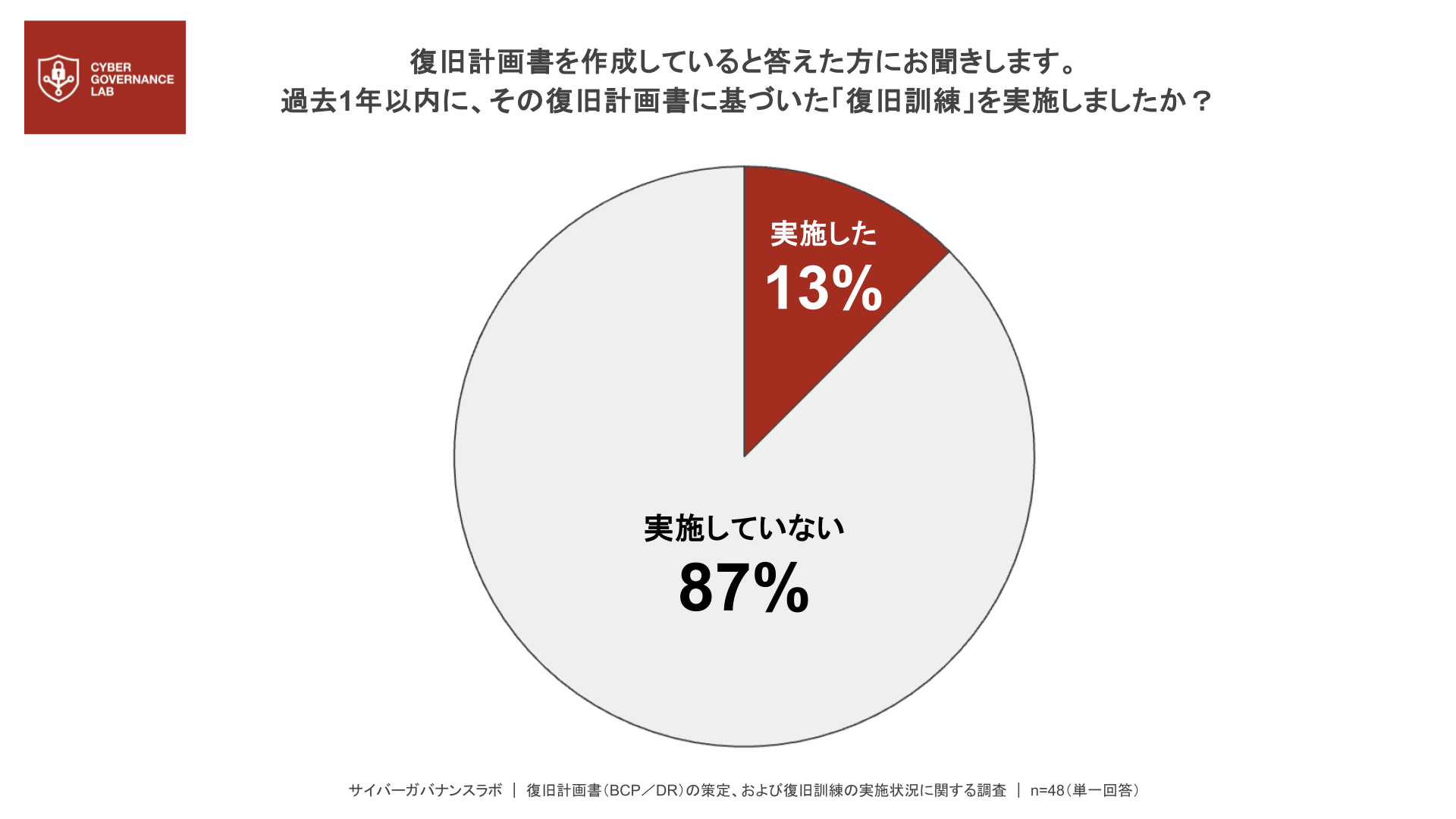 復旧計画書が形骸化していることが明らかに復旧計画書を策定している企業に対して、過去1年以内の復旧訓練の実施状況を尋ねたところ、実施したと回答した企業は13%にとどまり、82%が未実施という結果になりました。復旧計画書が存在していても、実際に機能するかを検証できていない企業が大半であることが分かります。