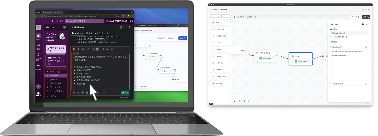「SamuraiAI」は、業務を自律的に実行する“実行するAI”として設計された、国産のワークフロー型AIエージェントです。単に回答やコンテンツを生成するのではなく、ユーザーの意図を理解し、必要な操作や手順を判断しながら、業務フロー全体を自律的に進めます。